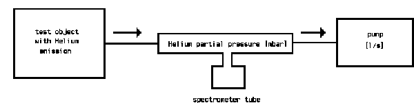The pumps built into the leak detector evacuate the test object. If, by spraying helium to the test object, traces of helium come into the vacuum, a helium partial pressure is produced, which is given by the amount of incoming helium and the amount pumped away by the pump. The spectrometer tube measures this partial pressure. The pumping speed of the involved pump is included as a constant to the measurement and multiplication of the measured partial pressure by the pumping speed gives the leak rate [mbar.l/s]. By calibration of the leak detector, this multiplication is done electronically and the reading of the meter is then calibrated in leak rate.