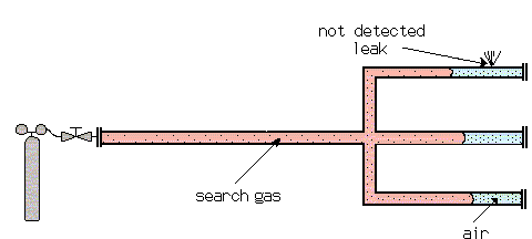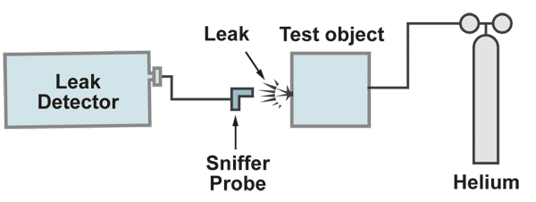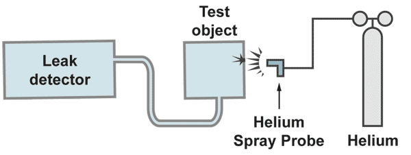 With a gas spay probe a fine helium beam is directed to the critical areas from the outside. If a leak is present helium is pumped to the mass spectrometer of the leak detector and rapidly displayed on the leak rate meter. The response time, which is a function of test object volume divided by the pumping speed, must be in the range of seconds. Longer response times make it difficult to locate the leak. With a fine movement of the spray probe is searched for the maximum helium signal. There is the location of the leak. It is recommended to start the leak search at the top of the system, moving slowly to the bottom.