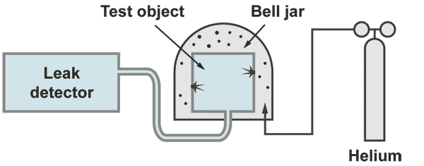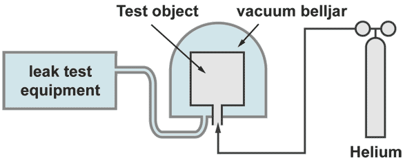 The test object is evacuated by the helium leak detector. The outside of the test object is covered by some envelope or bell jar which is filled with 100% helium. With a bell jar the 100% filling can be achieved by evacuating the bell jar prior to the helium filling. At an envelope, which cannot be evacuated because it is weak (for example some plastic foil) the 100 % filling can only be achieved by flushing helium in and measure at an outlet opening the helium concentration.