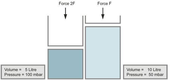 When the volume of a gas is decreased (for example by a piston), the pressure increases in the same ratio, if the temperature does not change. Compressing the volume to a half of its size doubles the pressure.