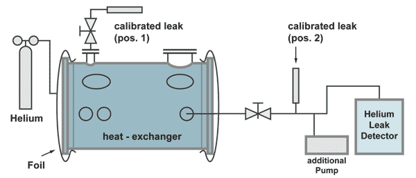 Large test objects, which cannot be placed under a bell jar, can be enbveloped by a plastic foil. With a sniffer probe the increase of the helium concentration under the foil is measured. Prior to the test the snifferprobe must be calibrated to measure helium concentration. This test can have long waiting times. The foil should be metalized for avoiding helium loses due to permeation. A detailed description of this procedure, including sample calculations, is given on the seminar on Leak Detection and leak test methods (see under products)